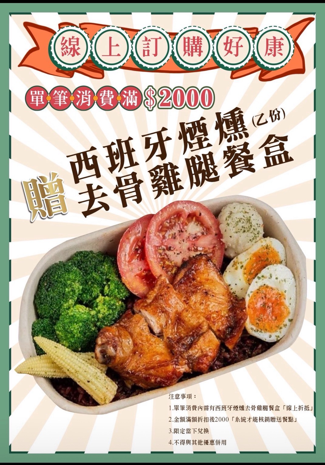 線上訂購單筆消費滿$2000元,非晉招待您西班牙煙燻去骨雞腿餐盒(乙份)